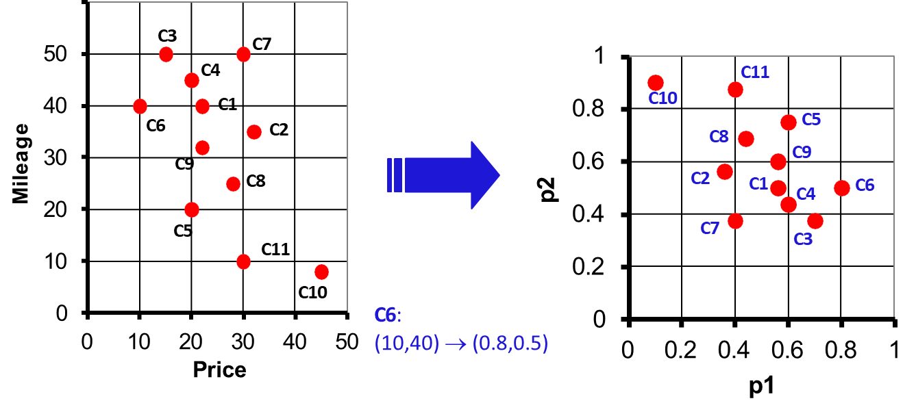 Intuitively, a tuple in a dataset is said to dominate another if it is equal or better across all dimensions and strictly better in at least one dimension. In practical terms, lower values are typically preferred (e.g., lower price or distance).