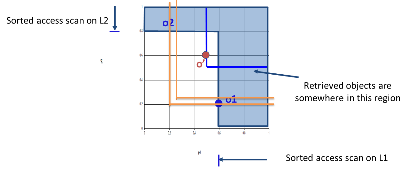 No Random Access (NRA): Designed for environments where random access is not possible. Maintains lower and upper bounds for each object’s score and stops when it is certain that the current top- cannot be beaten. Instance-optimal among sorted-access-only algorithms.
