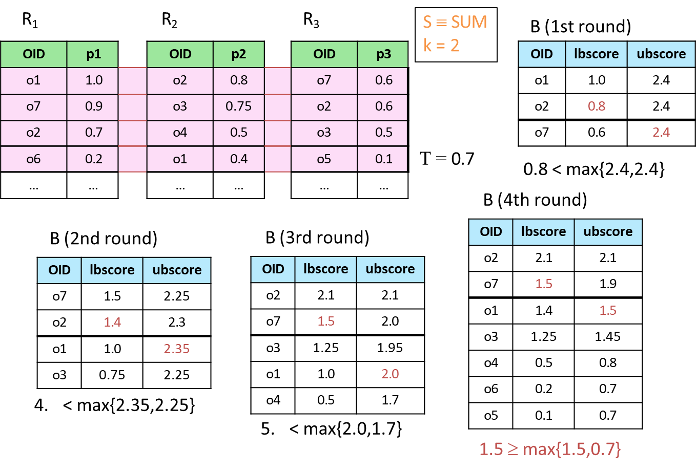 To determine the top-2 objects ( and ), only three rounds of access are necessary, as quickly emerges as the second-best option.