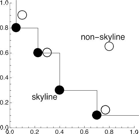 The set of all non-dominated tuples is called the skyline of the relation. This concept is also known as the Pareto-optimal set in multi-objective optimization or the maximal vectors problem in computational geometry. Graphically, in two dimensions, the skyline can resemble the contour of the dataset when visualized.