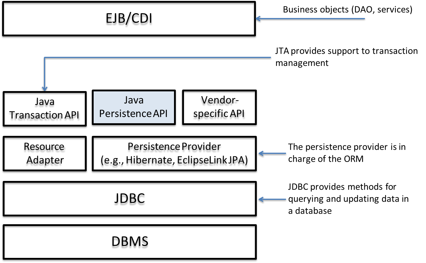 Java Persistence API (JPA): The standard API for persistence.