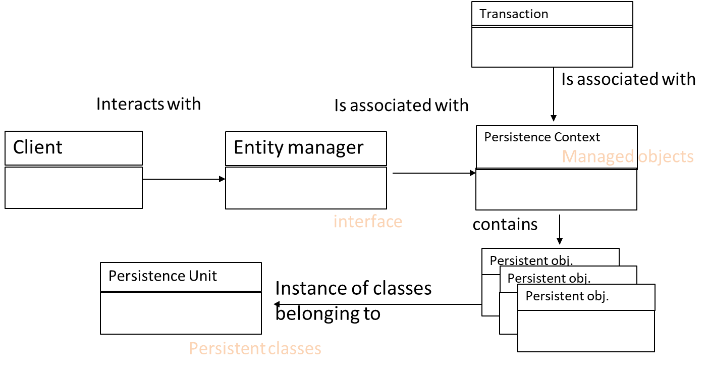Client: A component (e.g., an EJB) that interacts with the persistence context indirectly through an EntityManager.