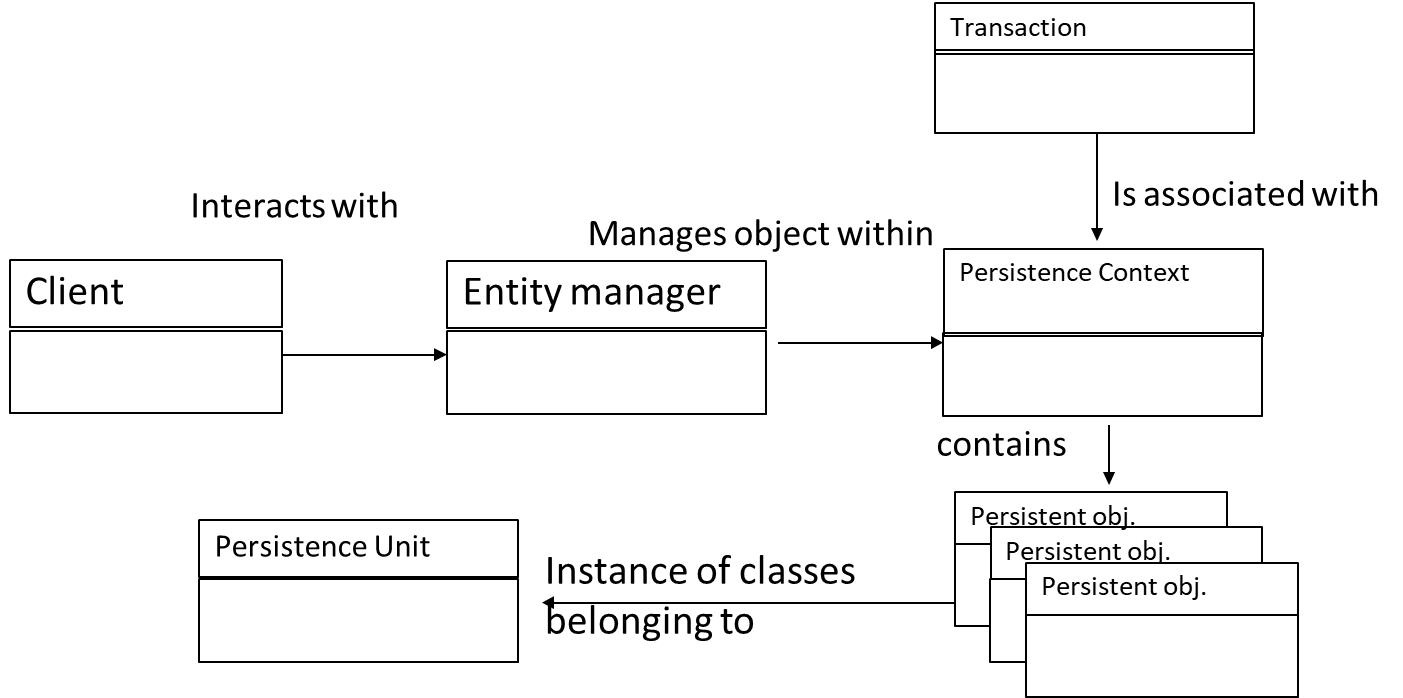 In a typical JEE architecture, the client—such as a web servlet or a front-end component—interacts with a business component, often implemented as an Enterprise JavaBean (EJB) or a Contexts and Dependency Injection (CDI) bean. These business components serve as intermediaries between the client and the persistence layer, communicating with the Entity Manager to perform operations such as creating, reading, updating, or deleting entities.