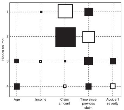 A useful tool for visualizing the importance of variables in a neural network is the Hinton diagram. This technique graphically represents the weights between the input variables and the hidden neurons in the network. In a Hinton diagram, each weight is depicted as a square, where the size of the square corresponds to the magnitude of the weight and the color indicates its sign (e.g., black for negative weights and white for positive weights).