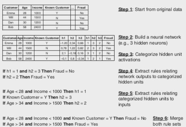 - Rule extraction: This technique involves decomposing the neural network’s internal workings to extract if-then classification rules. By inspecting the weights and activation values, the behavior of the neural network can be mimicked and translated into interpretable rules.