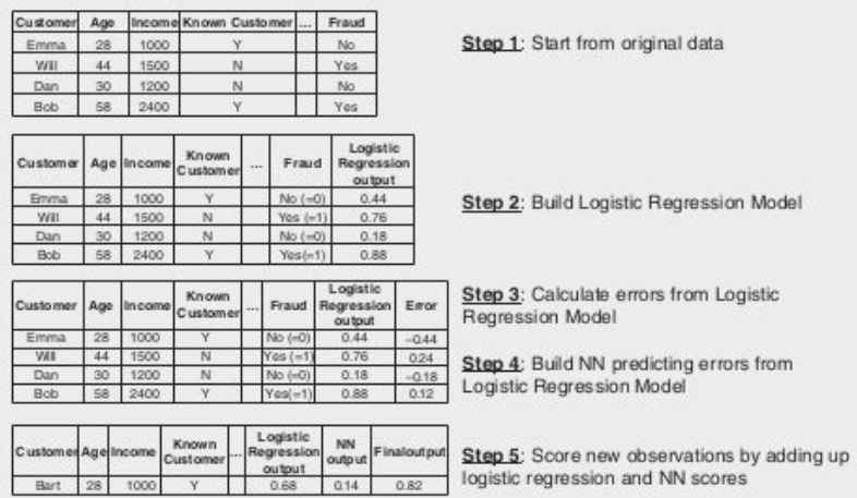 In the first stage, an easy-to-understand model such as linear regression or logistic regression is estimated. This model provides interpretability and insights into the relationship between predictors and the target variable. In the second stage, a neural network is used to predict the errors made by the simple model, using the same set of predictors. This nonlinear model captures complex patterns and improves the overall performance of the model.