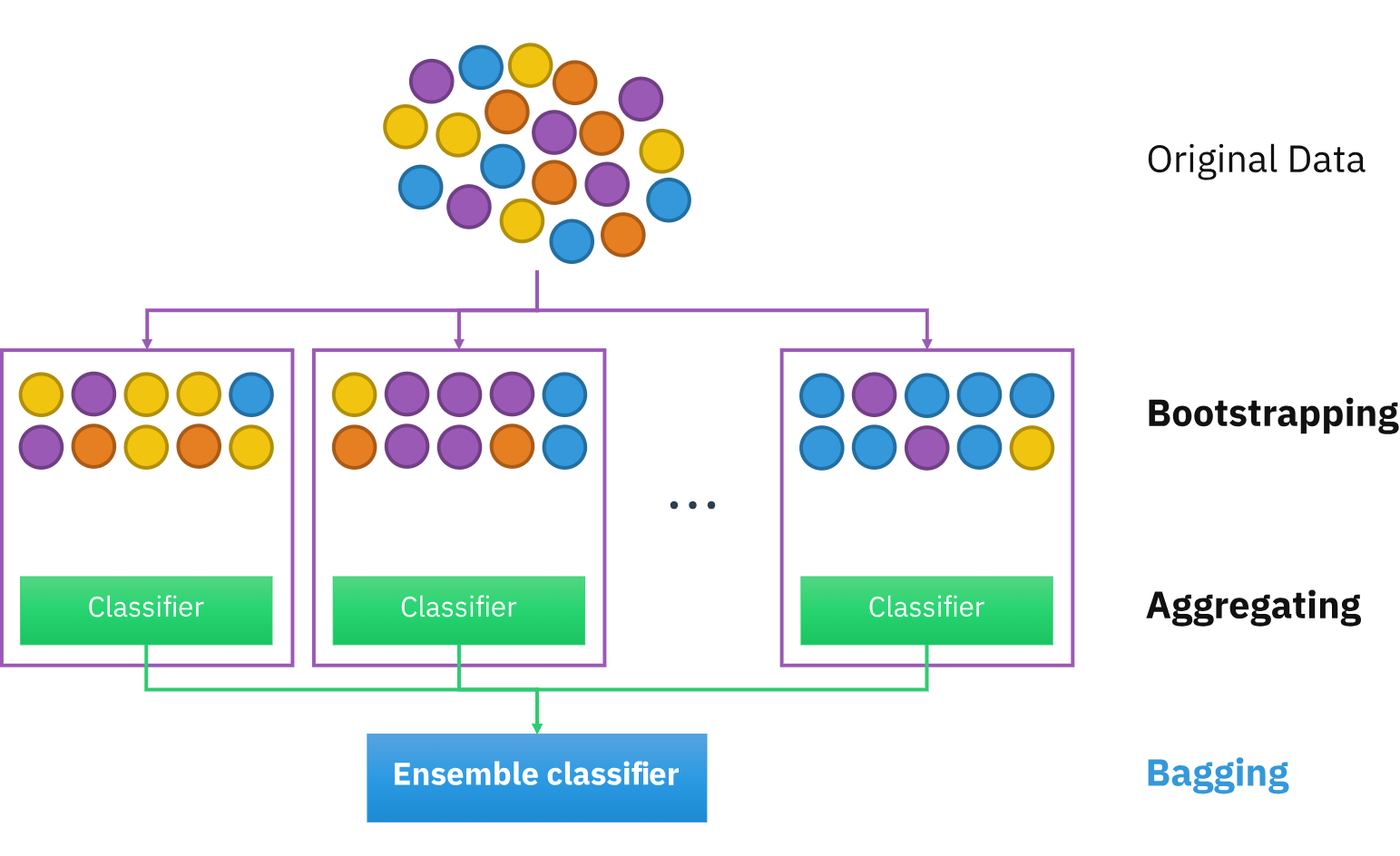 - Bagging: Bagging, short for bootstrap aggregating, involves creating multiple bootstrap samples from the original dataset and building a classifier for each sample. The final prediction is made by combining the predictions of all the classifiers, either through voting (for classification problems) or averaging (for regression problems).