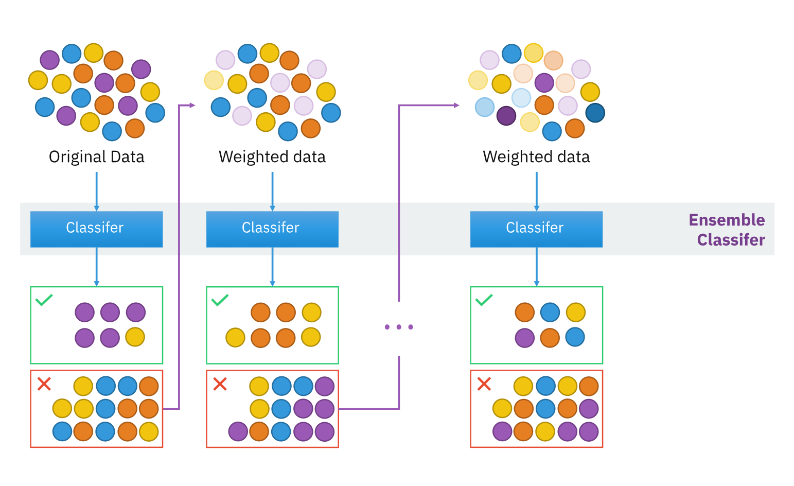 - Boosting: Boosting is an iterative process that starts with equal weights assigned to each data point. In each iteration, the weights are adjusted based on the classification error, giving more weight to misclassified cases. The final ensemble model is a weighted combination of all the individual models.