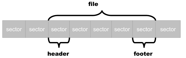 On the disk, each file entry is composed of a set of clusters, with each cluster consisting of a set of sectors. The file itself is made up of valid sectors where the actual data is stored, as well as slack sectors that mark the end of the allocation. In the slack space, fragments of deleted data can accumulate, and these fragments can be recovered using a technique called file carving.