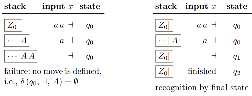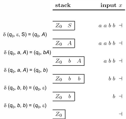 where and . The stack’s contents are not constrained and could be any string (including the empty string), though the input string must be fully processed (i.e., remains).