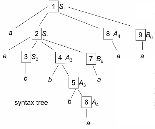 Consider the following the sequence of symbols to be parsed: “.” Here, the numbers next to each grammar rule represent the order in which these rules are applied, while the subscripts on non-terminal symbols indicate which rule produced each component of the syntax tree. Importantly, this analysis is guided by a Backus-Naur Form (BNF) grammar, where each production rule dictates how non-terminals are expanded into sequences of terminals and other non-terminals, strictly in a left-to-right order as the parser proceeds through the string from leftmost symbol to rightmost.