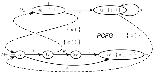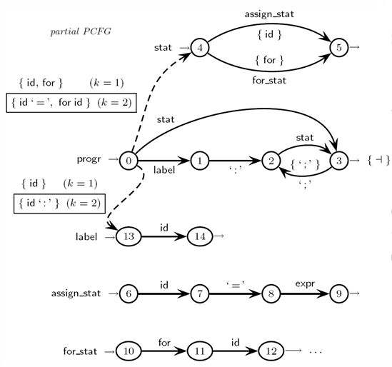 Call Arcs: Represented by dashed arcs, these arcs are marked with guide sets that specify the anticipated input characters following the call. Guide sets on call arcs help the parser choose among potential actions, including scanning a terminal, initiating a specific call transition, or exiting if the machine is in a final state.