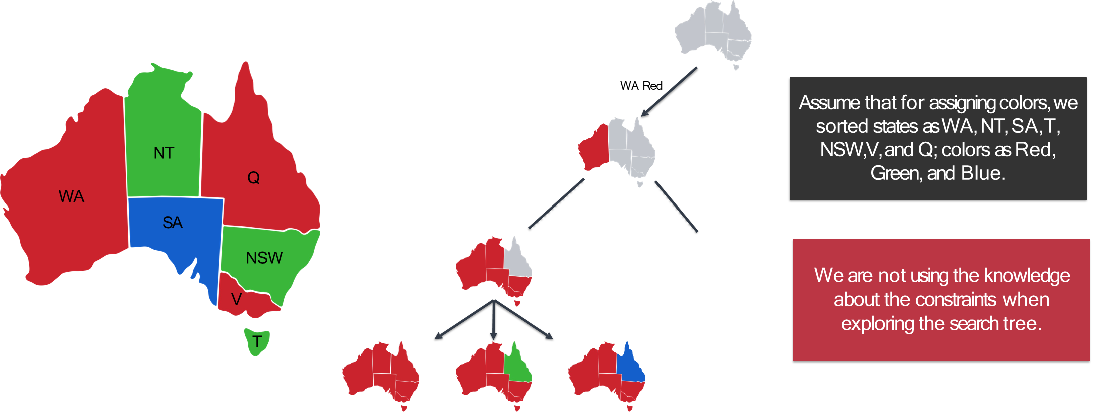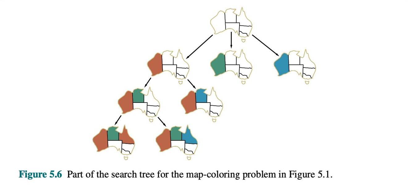 [WA=red, NT=green]is the same solution as[NT=green, WA=red]. - Check Constraints as You Go: When we consider assigning a value to a variable, we immediately check if that value is consistent with all previously assigned variables. If it violates any constraint, we discard that value and do not explore any deeper down that path. This is effectively an “incremental goal test.”