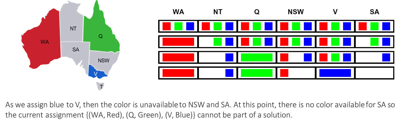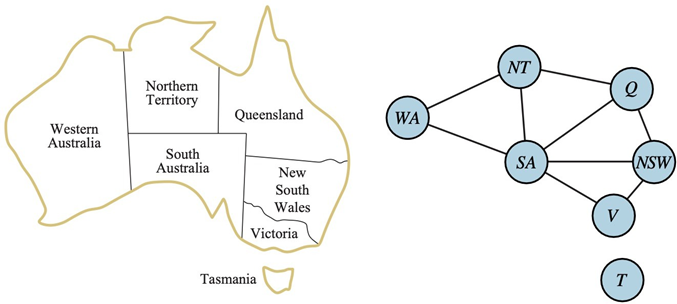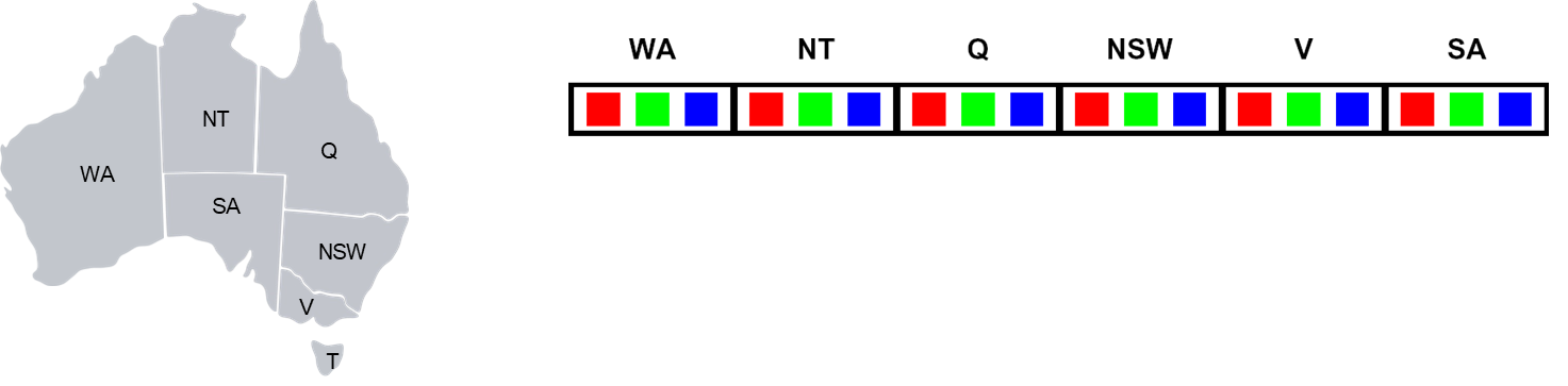 WA ≠ NT,WA ≠ SA,NT ≠ SA,NT ≠ Q,SA ≠ Q,SA ≠ NSW,SA ≠ V,Q ≠ NSW,NSW ≠ V.- Solution: A complete assignment, such as