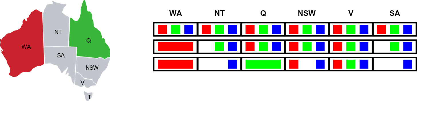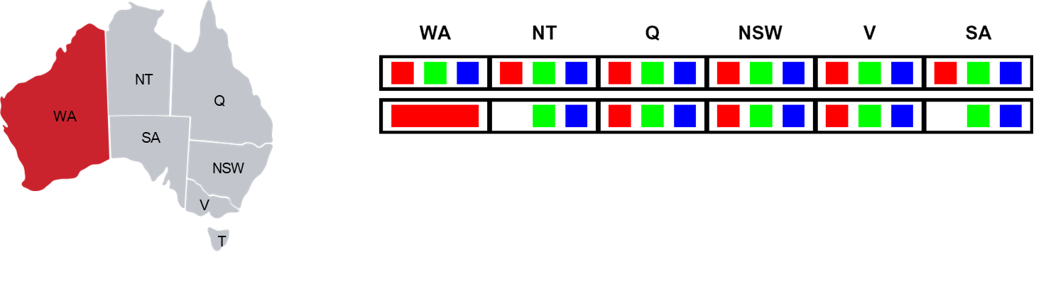 {WA=red, NT=green, Q=red, NSW=green, V=red, SA=blue, T=green}.