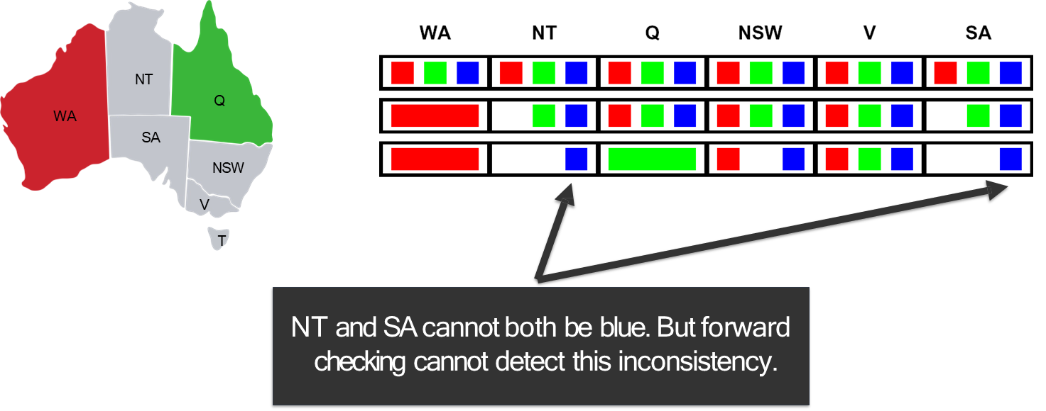 , there is a valid value for . For any value of , there is a valid value for , etc. AC-3 would find no inconsistencies.  - However, the problem has no solution. If