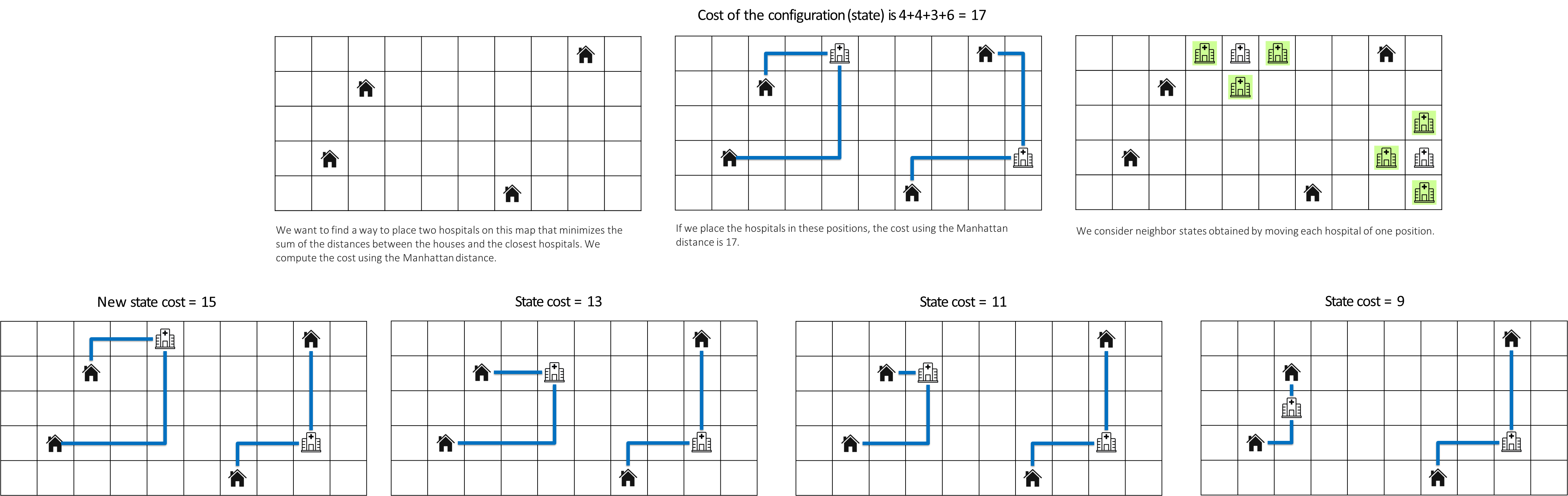 An illustrative example is the Homes and Hospitals problem, an optimization task where the goal is to place two hospitals on a grid to minimize the total Manhattan distance from a set of homes to their respective nearest hospital. A state is a specific placement of the two hospitals. The objective function is the sum of these distances, which is to be minimized. The neighborhood of a state consists of all placements reachable by moving one hospital a single step in any cardinal direction.