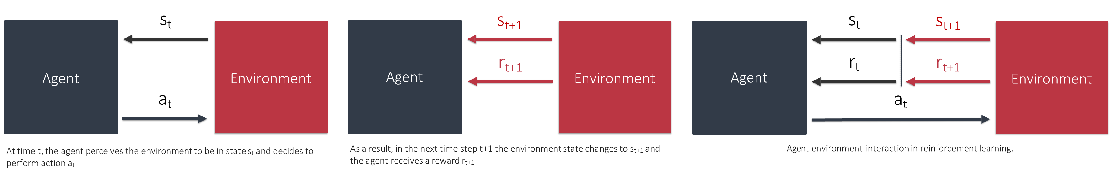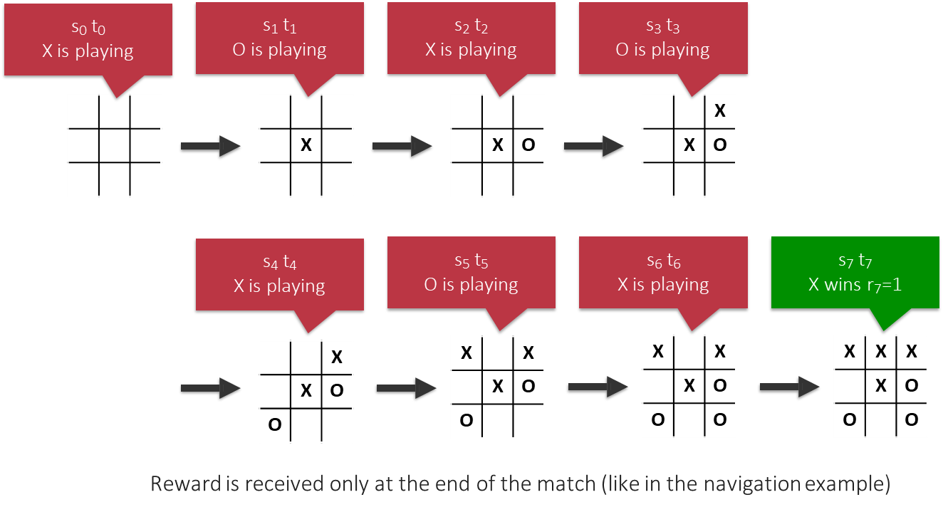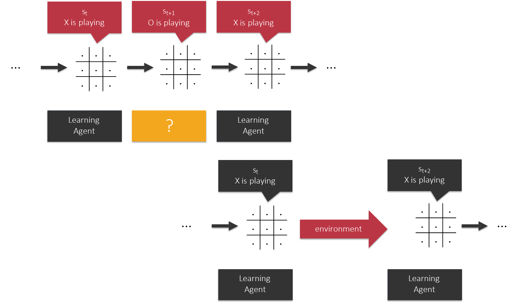 In an adversarial game, the agent’s goal is to win. The state of the environment is the configuration of the game board. The agent-environment interaction loop remains the same, but the environment’s response to our agent’s action