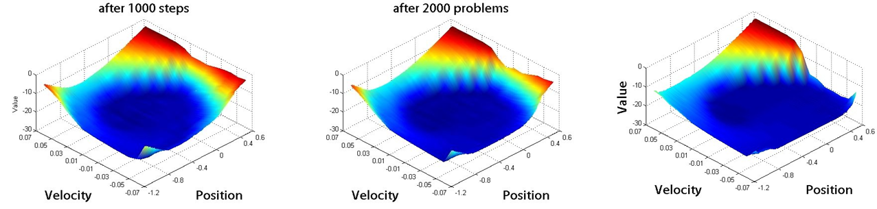 for this task. The lowest values (the deep blue “valley”) are in the center at low velocity, representing states where it is difficult to reach the goal. The highest value (the red peak) is at the goal position. The function correctly captures that high velocity, even when moving away from the goal, is valuable because it helps build momentum.|593x316]]