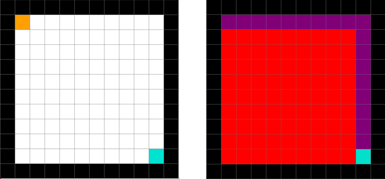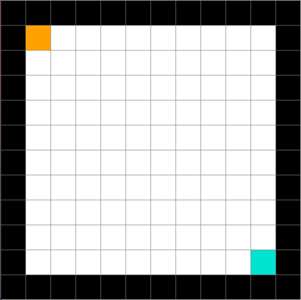 Consider a simple, empty 10x10 grid environment. The world is bounded by walls. The agent has a single starting position (orange) and a single goal position (blue).