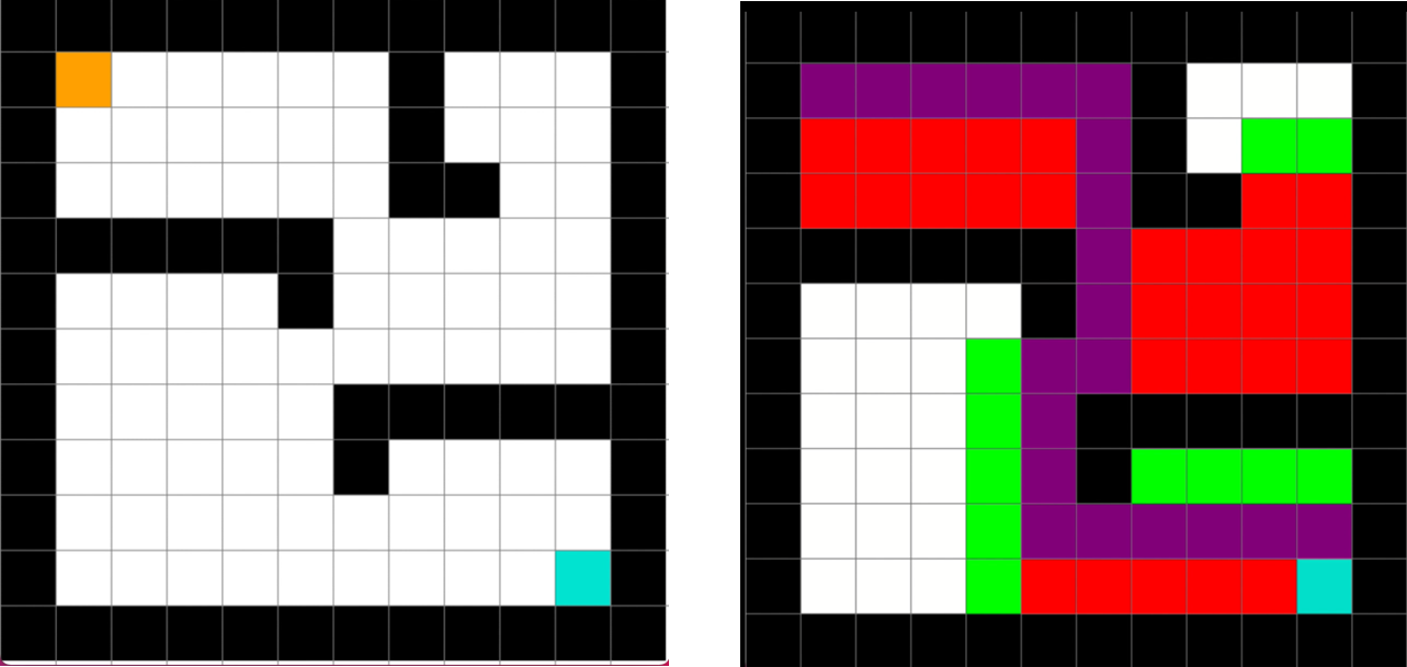 The result of the search is a single, optimal path from the start to the goal. The visualization below shows the nodes explored by the algorithm (in red - states that are explored by the algorithm - and purple - that represents the solution states) to find this path. The algorithm has solved this specific problem instance.