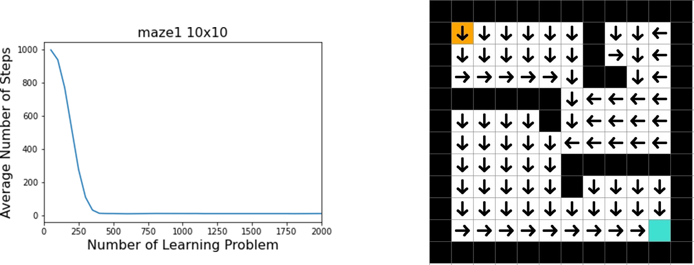State Up Right Down Left (1, 2) 0.358 0.397 0.397 0.000 (1, 3) 0.377 0.418 0.418 0.000 … … … … … (1, 6) 0.440 0.488 0.000 0.000 … … … … … (2, 6) 0.463 0.513 0.000 0.463 … … … … … Notice in the table, for state (1, 6), the value for moving ‘Down’ is 0.000. This corresponds to a location in the maze where moving down would hit the horizontal obstacle, correctly identifying it as a poor action. This demonstrates how the Q-function learns the “rules” of the environment implicitly through interaction.