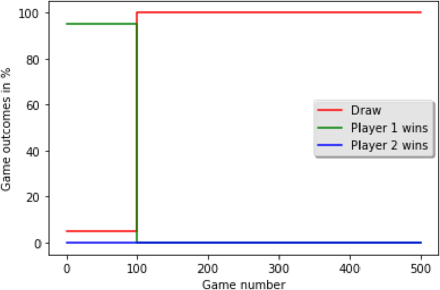 The Q-learning agent fails to learn effectively. After about 100 games, the outcome stabilizes: the Minimax player (Player 1) wins a small percentage of games, and the rest are draws. The Q-learning agent (Player 2) never wins. Because the Minimax opponent is perfect, the learning agent is never “allowed” to win and thus never experiences the +1 reward needed to learn a winning policy. It only learns to not lose (i.e., to force a draw).