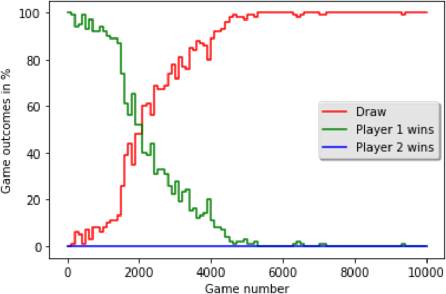 This change has a dramatic effect. The Q-learning agent now learns to play optimally. Initially, the Minimax player (green line) wins most games. However, as the Q-learning agent plays more games, it begins to understand the opponent’s strategy. The number of draws (red line) steadily increases, while the Minimax player’s wins decrease. After about 6,000 games, the Q-learning agent has learned a perfect policy, and every game ends in a draw. The stochasticity provided the necessary exploration for the agent to learn.