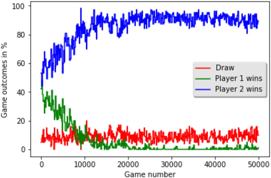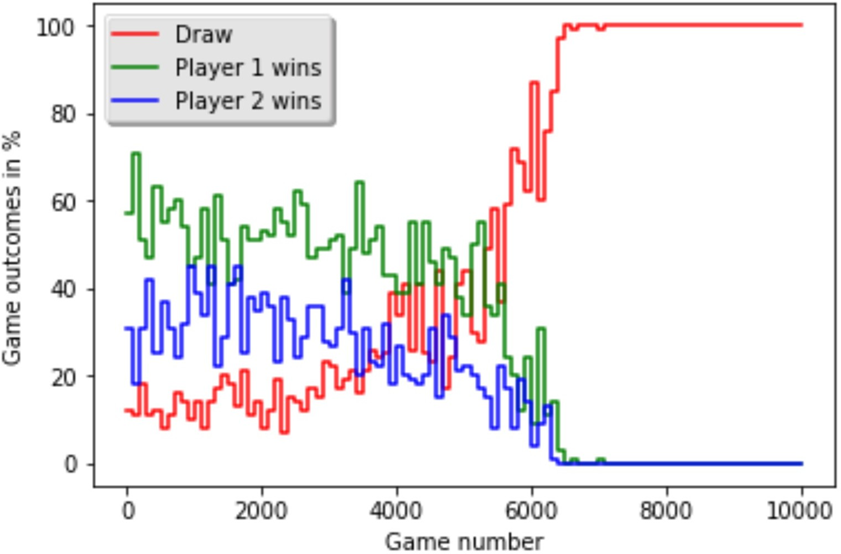 The learning process is much more volatile. The win percentages for both players fluctuate wildly as they explore the state space and discover new strategies, effectively changing the “environment” for their opponent. For instance, if Player 1 discovers a simple winning trick, its win rate will spike. But then Player 2 will learn to counter that trick, and its own win rate will rise. Eventually, after about 7,000 games, both agents learn the optimal Tic-Tac-Toe strategy, and all games converge to a draw. This “self-play” approach is a powerful concept used in advanced systems like AlphaGo.