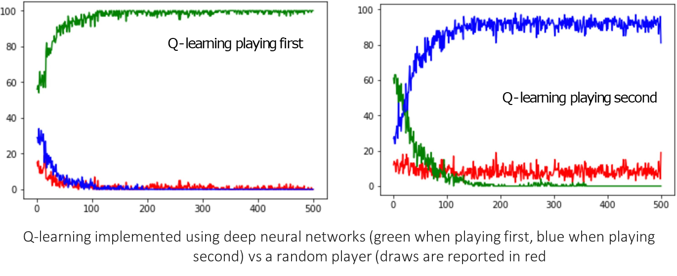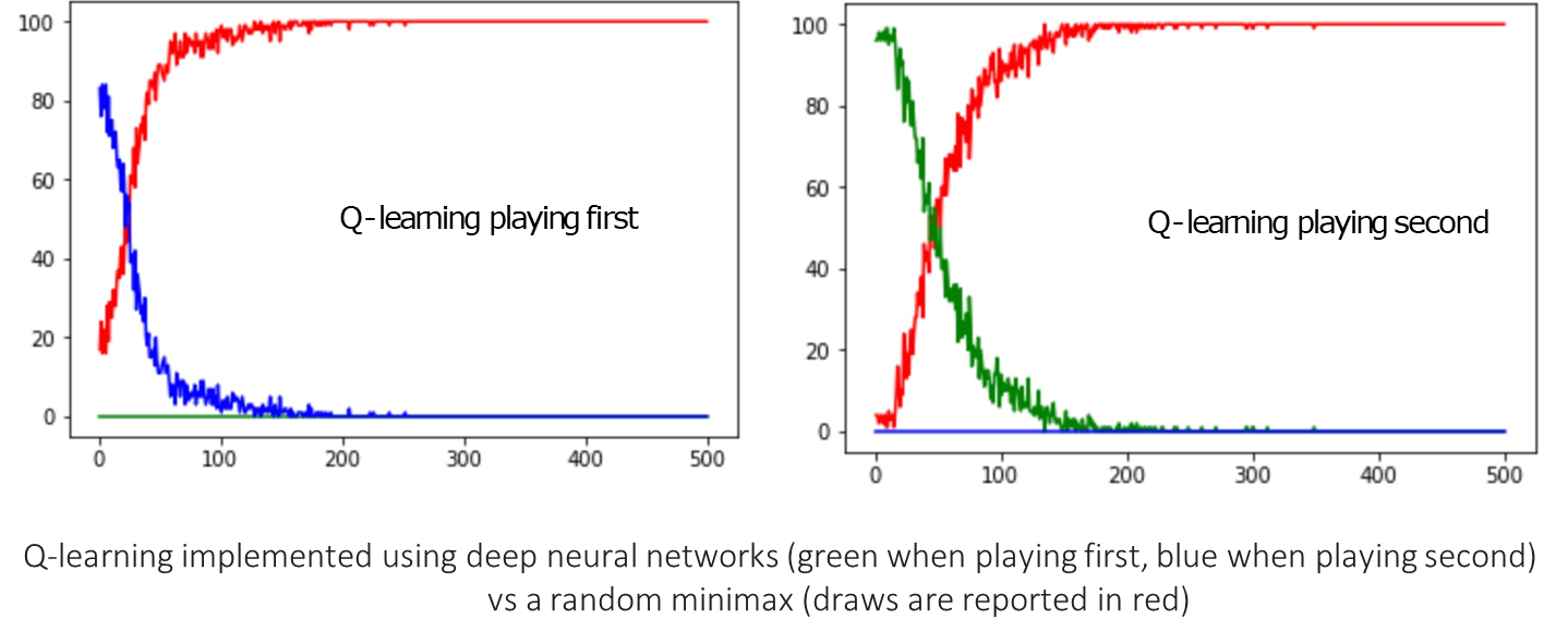 Talking about results, the DQN was trained in two scenarios: against a random player and against a random Minimax player. The performance over thousands of games is shown below.