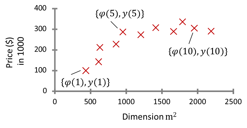 Consider the task of predicting the price of a house based on its size. In this case, we define: