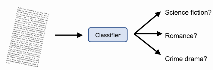 - Multi-class classification: The text is assigned to one of many classes. This is used in authorship attribution, web search query intent classification, etc.