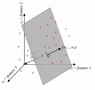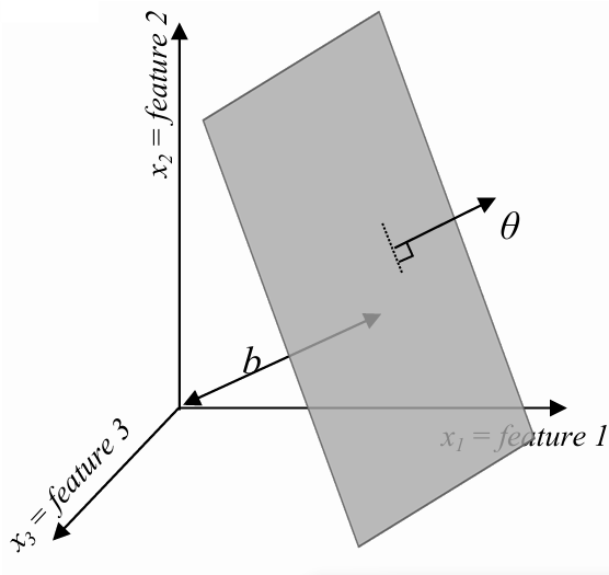 is the dot product between the feature vector and the model parameters is an -dimensional vector that is orthogonal to the hyperplane is the offset term, indicating the distance of the hyperplane from the origin. If , then is the distance of the hyperplane from the origin, otherwise the distance is . is just another parameter of the model and usually is denotated as .