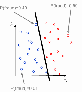 In machine learning, when making predictions, the certainty of a prediction increases as the distance of a data point from the decision boundary grows. The decision boundary is the surface that separates different classes — in this case, fraud and non-fraud. The further a point is from this boundary, the more confident the model is about the classification.