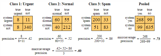 - Microaveraging: Combine the decisions for all classes into a single confusion matrix. From this matrix, compute the overall precision and recall.