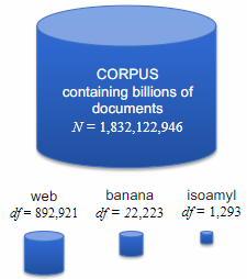 The Inverse Document Frequency (IDF) simply weights each term by the negative-log probability of finding term in random document: