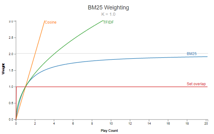 - The importance of a term asymptotes to a maximum value, so the score does not go to infinity regardless of how many times the term appears in the document.