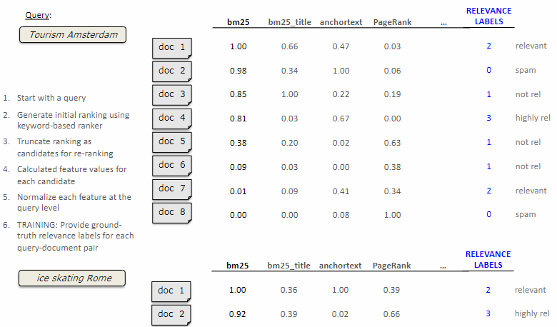 Try to train a Machine Learning model to predict relevance of documents to a query. The Machine Learning solution for this problem consists of two components: