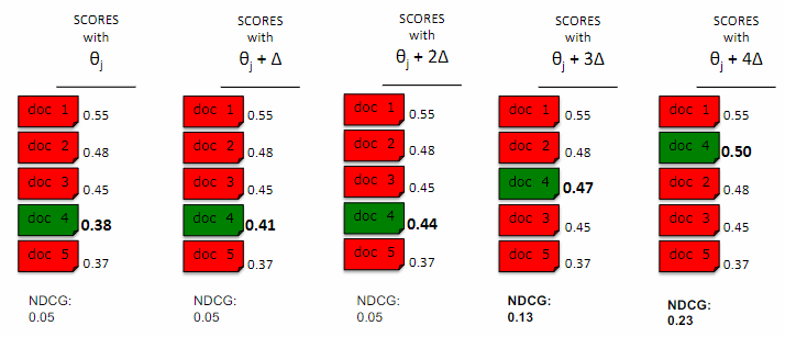 The problem of this approach is that the ranking loss function are non-differentiable (or flat) with the respect to parameters of retrieval function. This means that we can’t use gradient-based optimization techniques to optimize the ranking function.