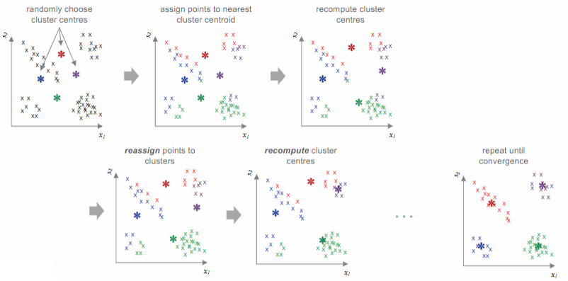 repeat steps 2 and 3 until convergence, when the centroids stop moving