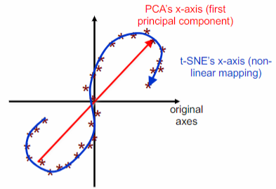 The t-SNE algorithm is a non-linear method for reducing the dimensionality of data. It is commonly used to map high-dimensional data onto a 2D or 3D space. Unlike PCA, t-SNE creates a non-linear combination of the original attribute values to represent the mapped points. The axes in the mapped space are obtained through a non-linear transformation (rotation) of the original axes.