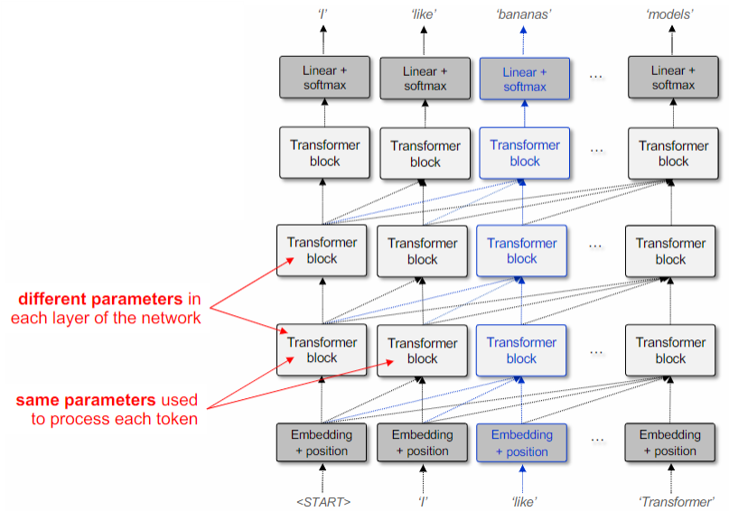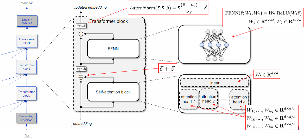 - Multiple transformer blocks that are stacked on top of each other. These blocks modify the embedding at each position.