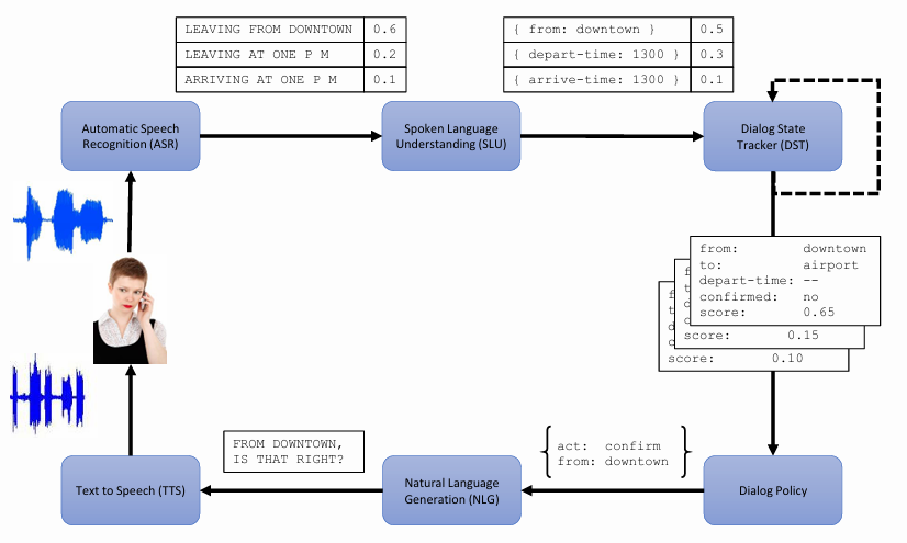 In dialogue systems, Automatic Speech Recognition (ASR) or Natural Language Understanding (NLU) systems can assign a confidence value to indicate how likely they understood the user’s input. This confidence value can be estimated based on various factors, such as the acoustic log-likelihood of the utterance, prosodic features, and the ratio of the score of the best interpretation to the second-best interpretation. To determine the appropriate action, a confidence threshold can be set.