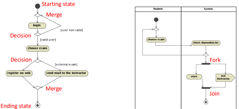 For example, an activity diagram could be used to describe a "register on the web" process by identifying the responsibilities of both the student and the system.