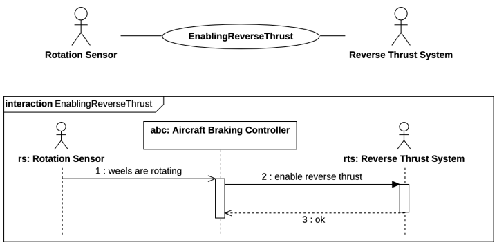 Modeling the braking logic of an Airbus aircraft using UML involves understanding the system’s core entities, their relationships, and dynamic behaviors, such as how reverse thrust is enabled when certain conditions are met. This approach provides a high-level representation of the system’s functionality but lacks the ability to fully express assertions about domain properties and requirements. As such, while UML offers a graphical overview, it must often be complemented with additional formal or informal descriptions to express critical logical assertions that UML cannot capture directly.