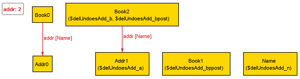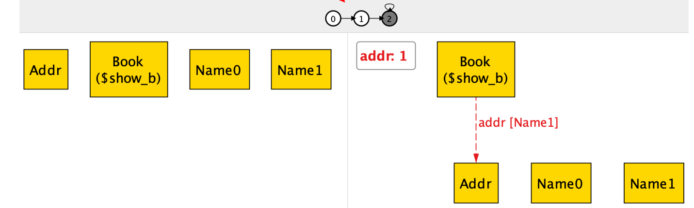 pred showAdd [b, bpost: Book, n: Name, a: Addr] { add[b, bpost, n, a] #Name.(bpost.addr) > 1}