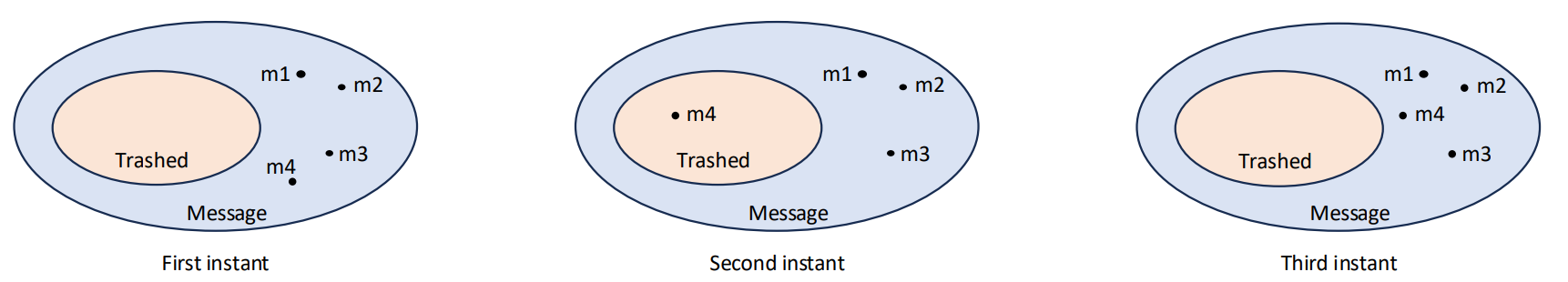 To illustrate the use of these temporal operators in a different context, we can model a mailbox system where messages can be deleted and later restored. This model will introduce the concept of “trash,” representing messages that are no longer in the main mailbox but can be restored.