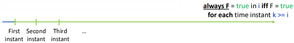 // In any state, a person either stays where he is or goes to another placefact MovingOrNot { all p: Person | always (moved[p] or unmoved[p])}// After arriving in Milan, a person is no longer travellingfact NoLongerTraveling { all p: Person | after (p.loc.name = Milan releases p.status = Travelling)}