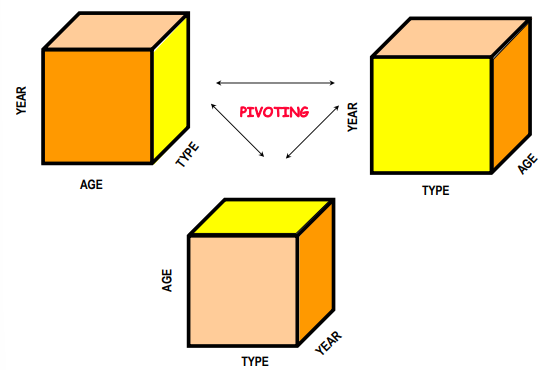 Pivoting: Also known as rotation, pivoting re-orients the data cube by selecting two dimensions to re-aggregate the data. This operation allows users to view the same data from different angles, facilitating comparative analysis across different dimensions.