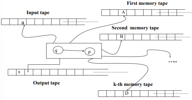 represents the set of states of the control device. denotes the input alphabet. is the memory alphabet (symbols written on the memory tapes). is the output alphabet (symbols written on the output tape). The function